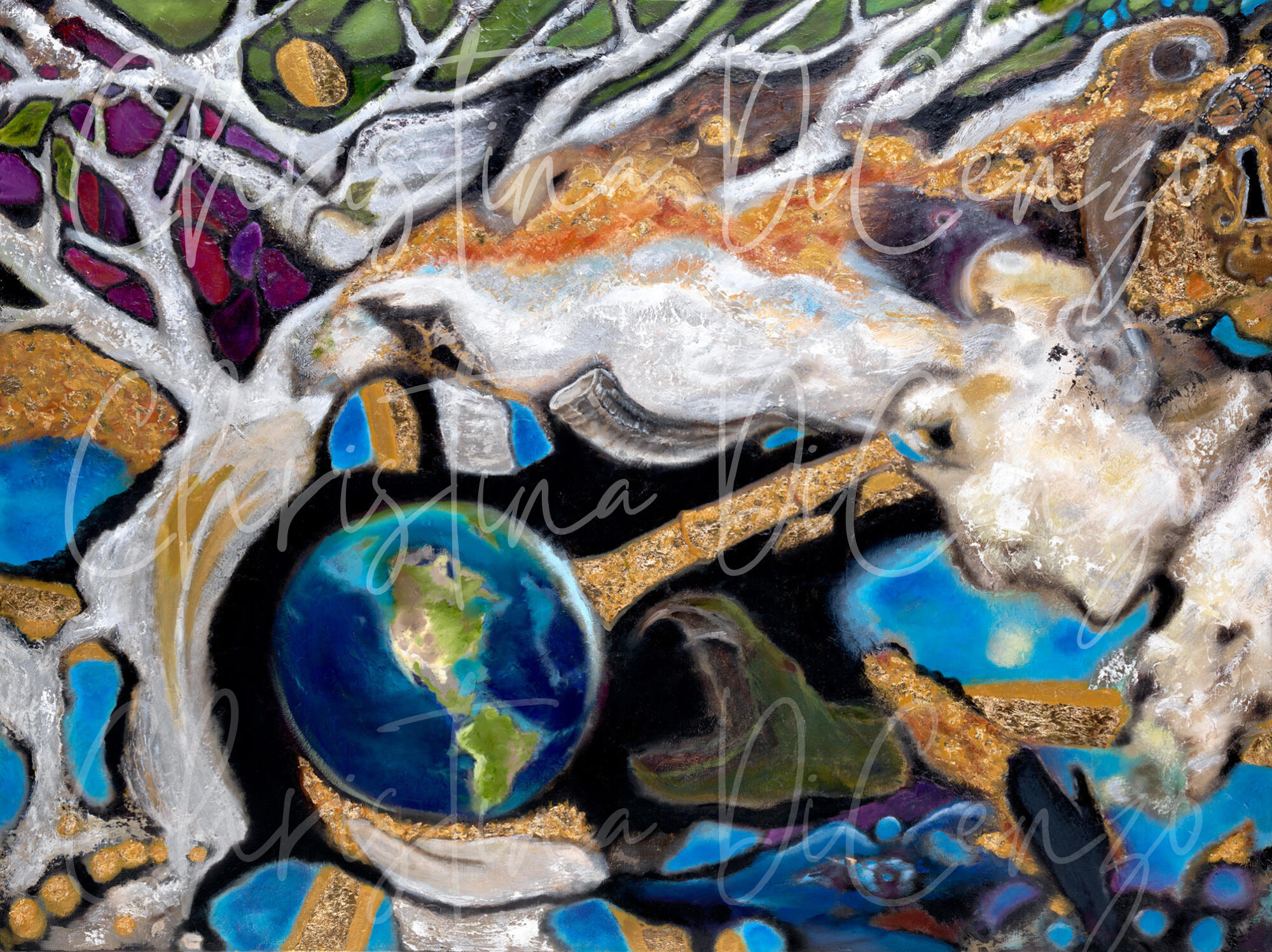 This is a very rare Prophetic Painting. I had taken a close-up picture of a distressed clay pot to paint as abstract. As I listened to Christian music in worship while painting the pot; I would see spiritual symbols appear. See if you can spot them? Starting at the bottom left of the painting moving counter clock wise.A hand lifting the world up to avoid a snake (Evil) from attacking the world. The snake’s head is cut off by prayer and an angel. The Watchman (the side view of a woman’s face) is looking through a binocular keeping close eye on the world.The Watchman represents those chosen in the Church as Intercessors for God’s people. As she hears from God (See Shofar near her ear) & sees trouble, she will blow the shofar, that will alert the Church. (Far upper left-stain glass). In the church we see the dove-representing the Holy Spirit holding an olive branch, Gods promises. We can vaguely make out a finger extended out for the dove to land on from the woman’s hair.We can see the head of a fish speaking in the ear of the watchman as well as a shofar Hearing from heaven which is key to hearing from God. (See the key hole to the right) This needs to be unlocked to blow the shofar. Far left bottom of the picture shows gold dots coming down from heaven-representing Jesus coming down to earth to walk calvary (the white path) which ends when He dies (when the road ends) and flourishes the tree of life which is seen through the church and the rest of the upper painting.The Gold leaf throughout the painting represents the Holy Spirit and Power of God. The blue throughout the painting represents The Heavens.