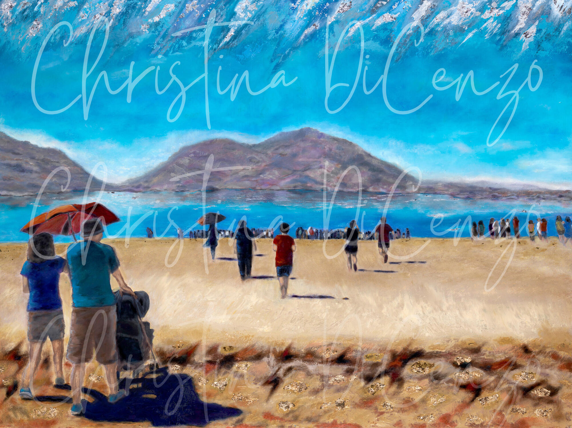 This painting is representative of the scene experienced by those attending the baptisms (The Church of Jesus Christ) during the 2018 GMBA Camp Out in Redlands, CA. As depicted in the painting, people used umbrellas to shield themselves from the intense sun, while gathered at the water’s shoreline.Spectators noted the flecks of gold that sparkled from the water looking like pieces of treasure provided by the Lord. The mountains rising majestically into the sky, created a breathtaking backdrop for those who had made this lifechanging covenant. They seemed to represent the power of our mighty God. During the baptisms, the spirit of God was so strong, that a nearby fisherman, Charlie, put down his pole on the pier, walked across the sands to our ministers, and surrendered his life to the Lord.He spoke of the struggles of his life and stated that he wanted the Lord’s help. Charlie, who was spending his day off from working at the park, also commented on the beautiful and amazing gold flecks reflecting through the water. Gold flecks were purposefully woven into the foreground to represent the gold that was seen by the spectators and Charlie. The artist chose specific spacing with the center most spectator to represent those who might have been contemplating their calling but had yet to render obedience.The various colors throughout the water capture the movement of the waves that constantly lapped on the shoreline and on the feet of those watching the beautiful event. The white baptism towels, that are always part of this ordinance, were carefully included in the scene.