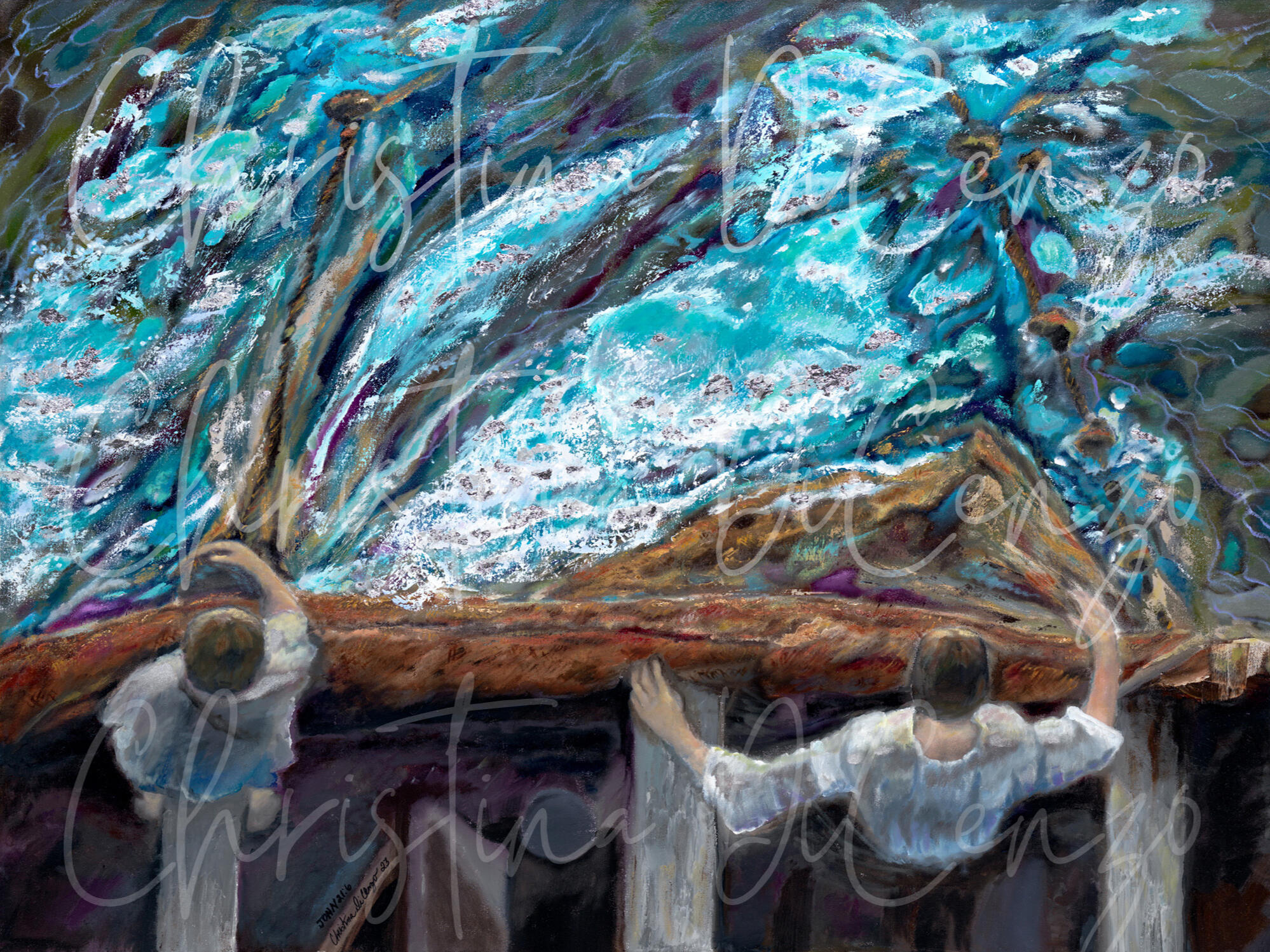 Artwork description: This painting was inspired when watching “The Chosen” TV Series; 1, episode 4. I fell in love with this clip, where Jesus tells Simon to cast your net on the right side. (John 21: 6).The scene was filmed from an aerial view. I was drawn to this unique angle (Looking down on the two disciples) as they threw the net one more time as Jesus asked. I paused the video and took a photo.I desired to paint this scene, to capture the unseen glory of God I perceived had to be in that moment with Jesus, Simon, and Peter. The moment right before 153 large fish were pulled into the small fishing boat.
